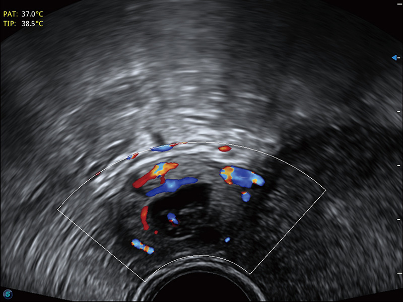 采用弯柄探头替代窥器下叶,巧妙实现了实时超声监控下的单人手术操作。探头频率高、图像清晰,不受肥胖影响,使得手术过程中无需充盈膀胱,即可有效进行胚胎移植、减胎手术的精准操作。